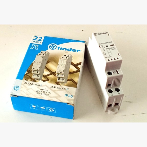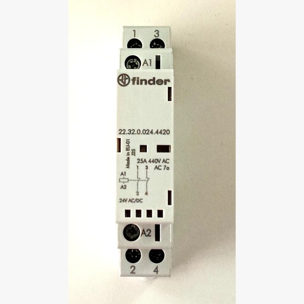 Meet the Finder 22.32.0.024.4420 — a slim, reliable, and space-saving contactor ideal for electrical panels and automated systems. Built with a 24 V AC/DC coil, this two-pole device switches up to 25 A resistive current, making it perfect for lighting control, motor circuits, HVAC systems, and general automation.